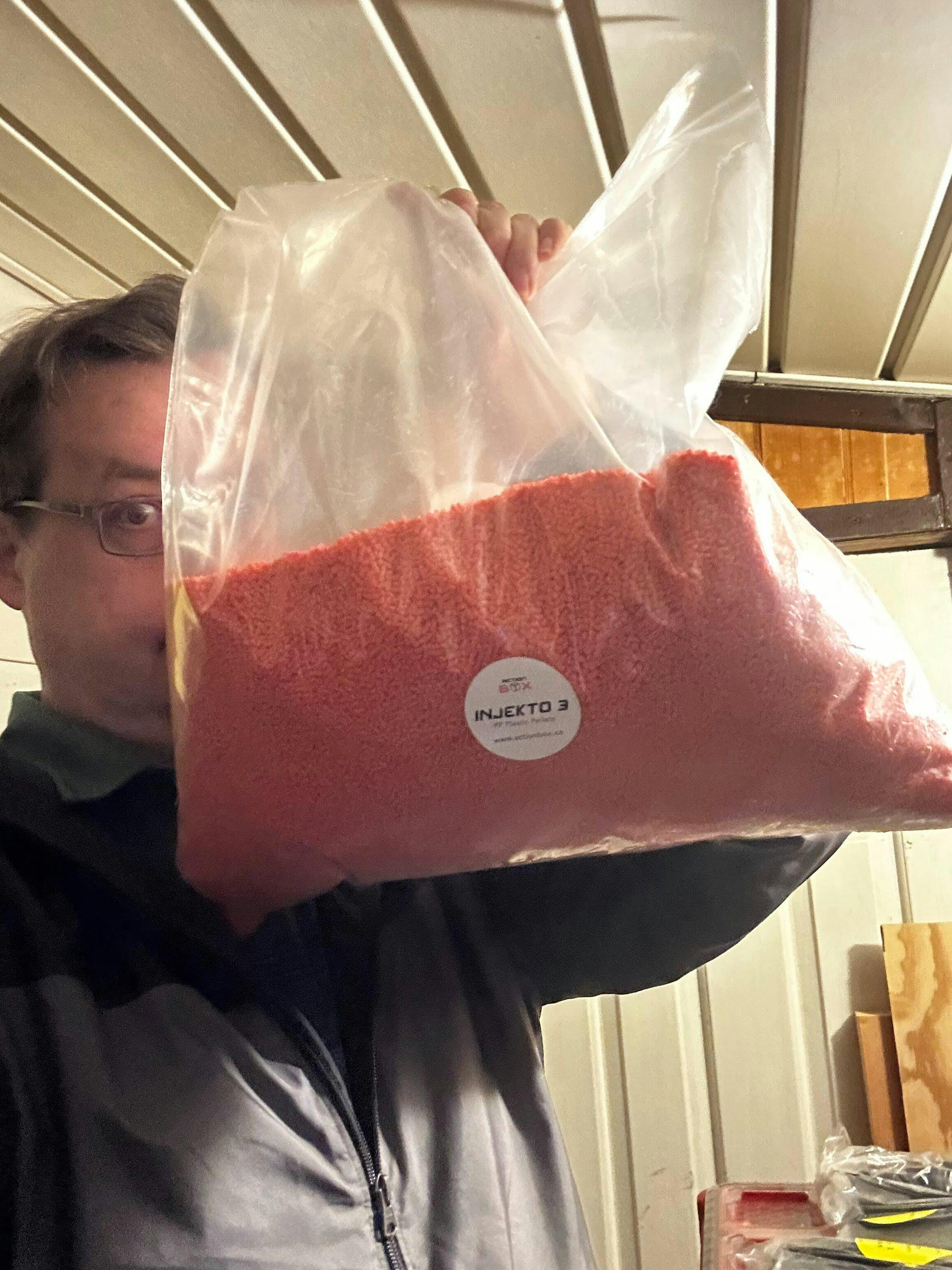 Bag of easy flow PP plastic pellets for use with injection molders for injection molding. Compatible with INJEKTO 3 by Action BOX.